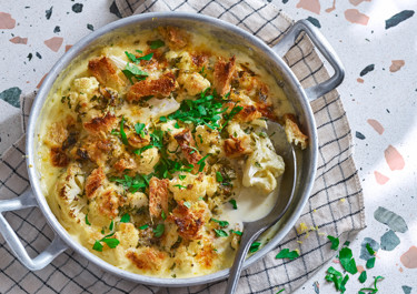 Blomkål i ugn gratinerad med vispgrädde, vitlök och cheddar. Denna vegetariska gratäng kan antingen serveras som ensamrätt med en matig sallad och t ex bulgur, eller som ett gott tillbehör till kyckling eller lammfärsbiffar. Blomkålen passar även att serveras ljummen på en buffé.