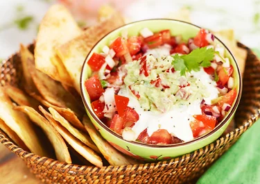 Varva tomatsalsa, crème fraiche och guacamole i en skål och servera chipsen vid sidan om.