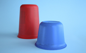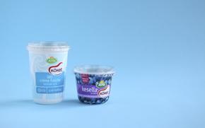 Ät upp och diska ur en stor och en liten plastburk från till exempel crème fraiche eller kesella.
