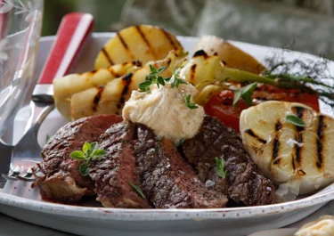 Grillad entrecôte blir om möjligt ännu saftigare om man grillar den i lite tjockare skivor och sedan skivar upp den vid serveringen. Kryddsmöret blir ännu godare när man vispar det och serverar det rumsvarmt.