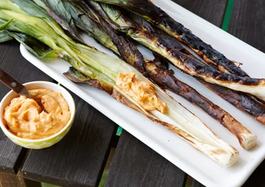 Grilla löken kolsvart men ät bara de mjuka inre bladen. Kryddsmöret är också gott till grillad aubergine och biff.
