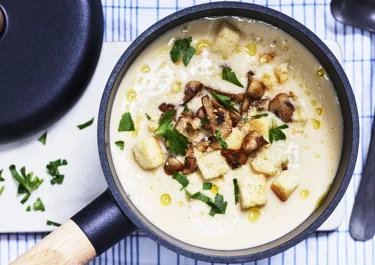 Till den här milda soppan passar det med smakrika tillbehör. Är det svampsäsong kan du gärna byta ut champinjonerna mot kantareller, karljohansvamp eller någon annan favorit.