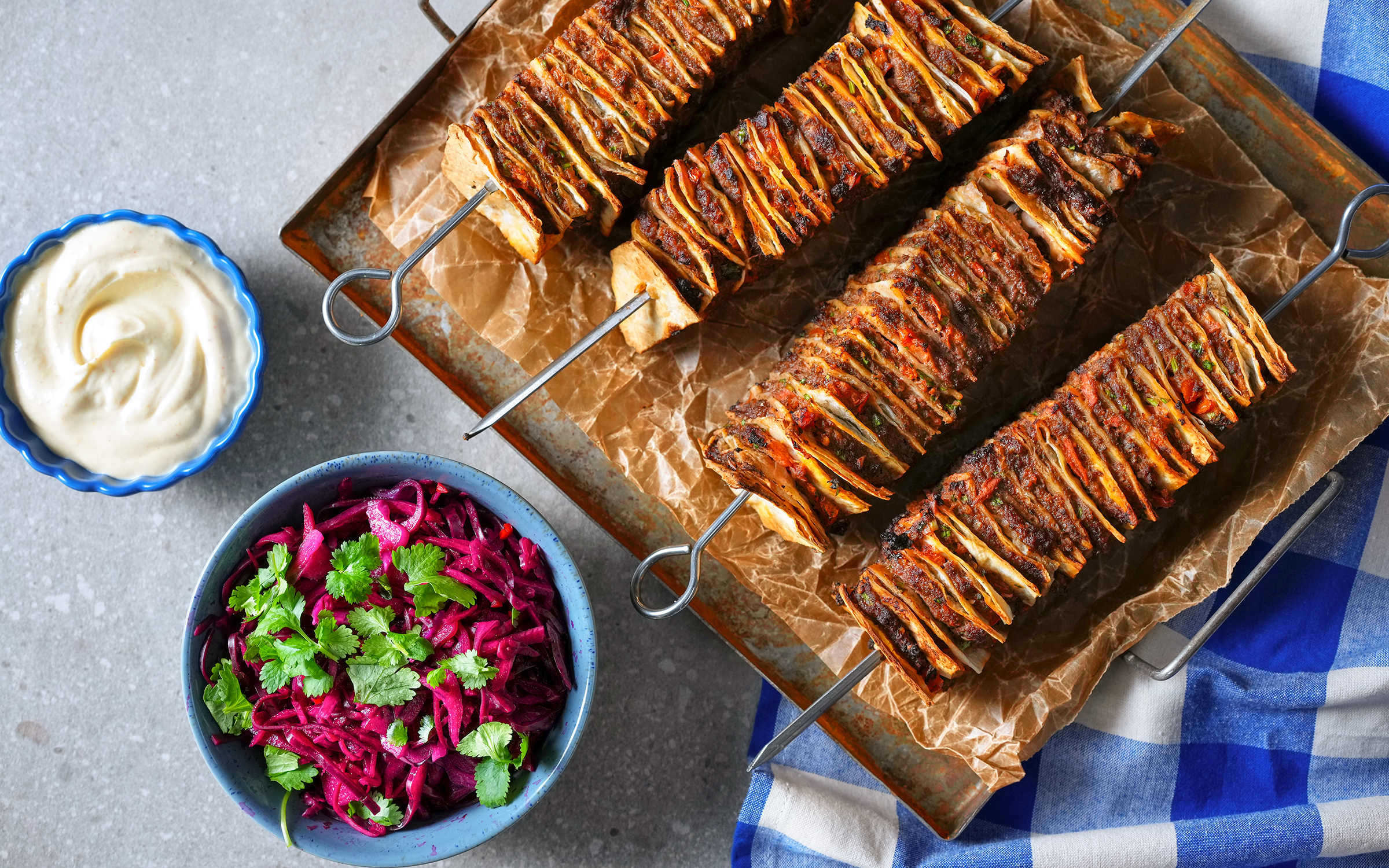 Kryddiga färsspett med rödkålssallad och mango crème fraiche